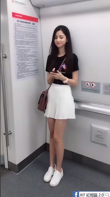 日前有網友在臉書粉絲專頁《 JKF 紅燈區 2.0 》貼出一段影片,影片中的場景似乎是在大眾運輸工具上面,畫面裡的女孩一頭清新黑色長直髮,身穿黑色上衣和白色短裙,打扮就像是親切的鄰家女孩,氣質出眾的她,卻有著「神仙級」超高顏值,一雙大長腿更是吸睛十足,只見女孩不時探頭看著前方,時而低下頭看自己的手機,影片最後似乎發現了有人對自己拍照,對著鏡頭微微一笑,還拋了個媚眼,讓網友瞬間暴動。