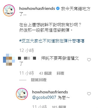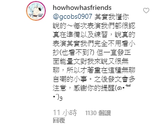 對此,HOWHOW也回應他能理解,但也補充說明其實每次表演時,他們都很認真練習與準備,「說真的表演其實我們完全不用看小抄」,他也開玩笑地表示「也看不到」,但對他來說不斷發正能量文很無聊,所以才會開這種玩笑自嘲,同時他也提到未來在發文上會多注意,感謝網友提醒。