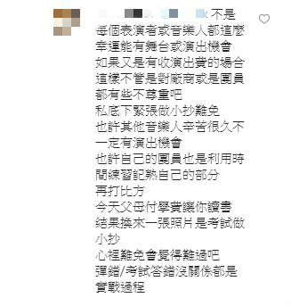 這則貼文一出,卻引來一位網友直接在底下留言痛批:「拜託不要再發這種文了」,引起其他網友議論紛紛,HOWHOW本人也向這位網友提出疑問,網友則解釋不是每個表演者或音樂人都有機會站上舞台表演,表演時偷看小抄對廠商或是對團員都有些不尊重,因為每個表演者都對表演付出很多,偷看小抄就像「今天父母付學費讓你讀書結果換來一張照片是考試做小抄」,其他人看了心裡難免會不舒服,在台上彈錯就跟考試答錯一樣是學習必經的過程,沒有必要用偷看小抄的方式勉強過關。
