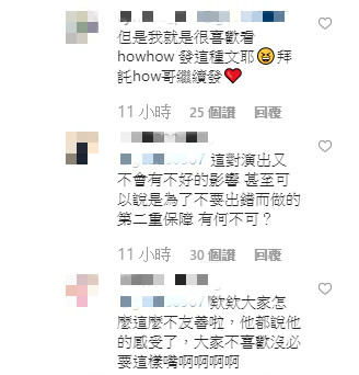HOWHOW超高EQ回應使得網友大讚HOWHOW的風度,同時也網友表示:「正義魔人來了,大家快看」、「可能感觸比較深」、「知道你認真,但對於how哥的貼文,你就輕輕鬆鬆地過吧~」、「但是我就是很喜歡看howhow發這種文耶」
