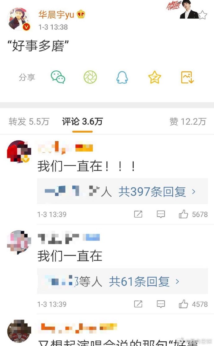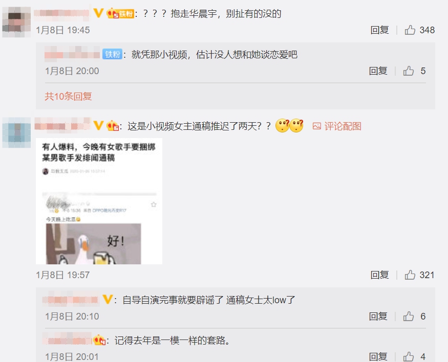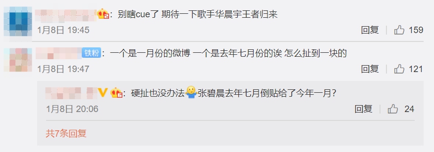 不過儘管兩人的戀愛細節看來似乎有跡可循,但大部分網友仍舊不買帳,紛紛留言「這是啥?又cue華晨宇,拉倒吧!散會。」、「又來蹭華晨宇了。」、「首先好事多磨碧晨經常這樣說,微博說過採訪也說過,而且很久以前的同款也沒必要在發一次,還有帽子很明顯是碧晨機場先戴所以何來倒貼?!」、「簡直是無中生有,抱走張碧晨。」、「華晨宇快跑!」、「強加因果」、「不會的。」、「真的沒必要,粉絲同款更多...難不成還和粉絲談了麼.....非粉但覺得好假」、「???抱走華晨宇,別扯有的沒的。」