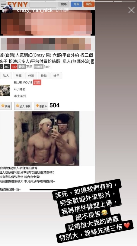 日前網路論壇中,有人發文標題寫上「台灣人氣網紅Crazy瘋男六部無碼外流」,意旨自己握有他們的性愛影片,另外也提到許多關鍵字,包括找三個妹子、扮演玩多人等,藉此吸引人注意,而內文則附上晨灰、Nick半裸體的照片,讓可信度上升。