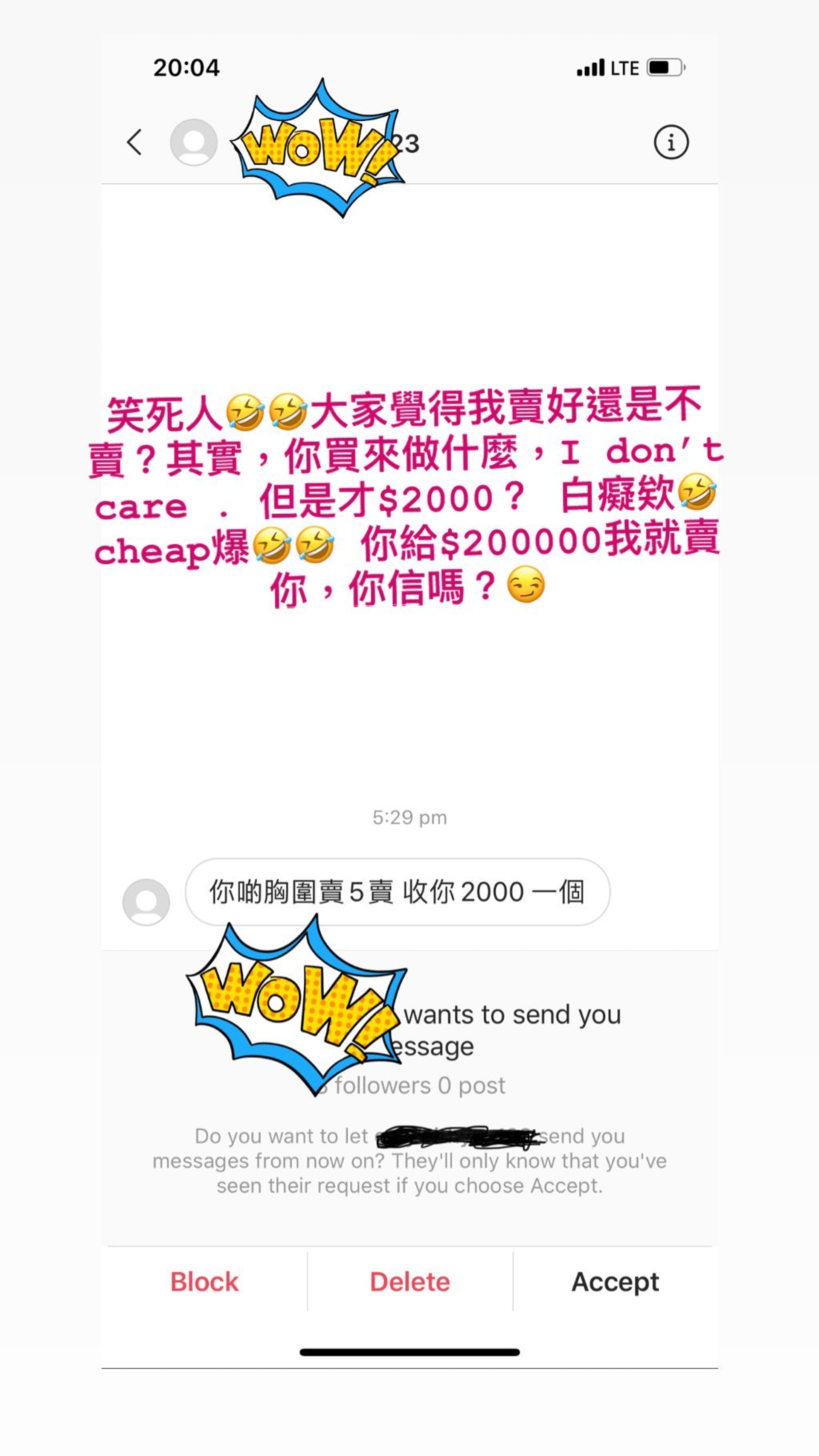 白雲日前貼出一則限時動態,是一張網友私訊的截圖,該網友問她「你啲胸圍賣5賣?(妳的胸罩賣不賣?),收你2,000一個。」表示要購買她的貼身衣物,白雲直接公開回覆「笑死人,大家覺得我賣好還是不賣?其實,你買來做什麼,I don't care.」但她對於該位網友只開價2000開玩笑表示不滿,「但是才$2000?白癡欸,cheap爆」,更喊話要該位網友「給兩萬元我就賣你,你信嗎?」