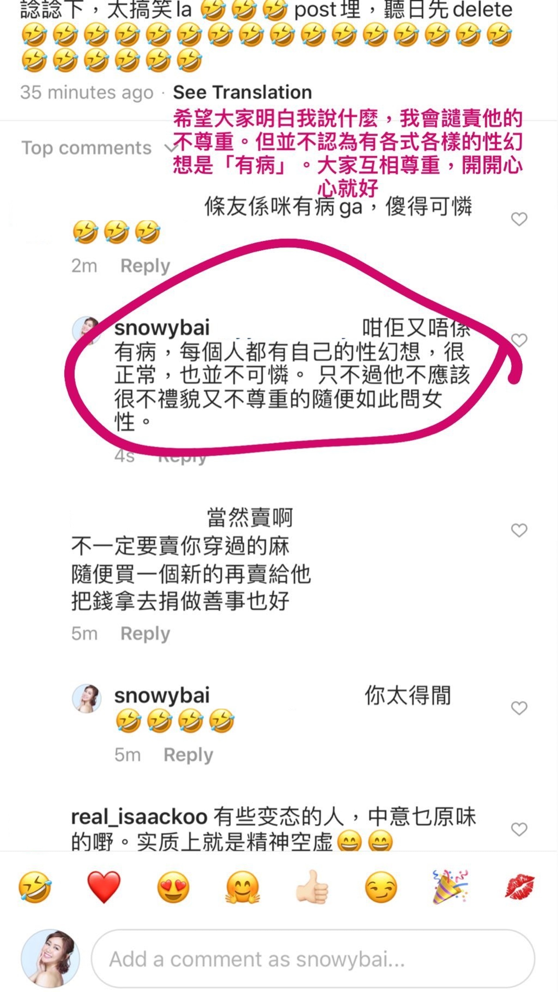 該則限時一出,引起眾多網友熱烈回應,白雲接著又把網友們的回覆貼出來,有人回應「當然賣啊,不一定要賣你穿過的嘛,隨便買一個新的再賣給他,把錢拿去捐做善事也好。」,但也有網友表示該位私訊者太「變態」,直言「是不是有病,傻得可憐。」,但白雲也沒有因為這樣的無理要求而生氣,反而大氣回覆「希望大家明白我說什麼,我會譴責他的不尊重,但並不認為有各式各樣性幻想是「有病」。大家互相尊重,開開心心就好」。
