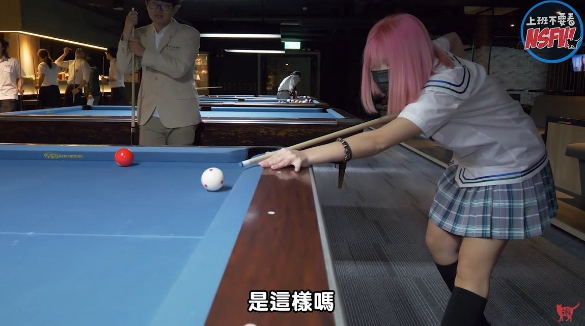 日前「上班不要看」發布新影片,所有團員換上高中制服,重回17歲學生時代打撞球,而其中最吸引人注目的,便是女神「關關」!關關穿著超短格子裙亮相,配上黑色長襪,露出完美「絕對領域」,令人目光無法移開。除了服裝讓大家為之一亮,關關的粉紅髮色也引起討論,十分有霸氣,打起撞球認真的模樣,讓網友不禁稱讚「又正又殺」!