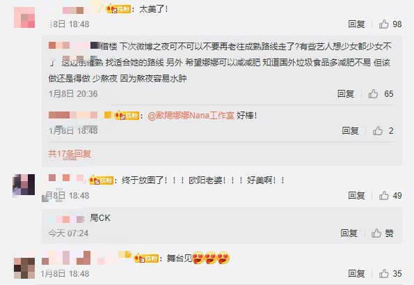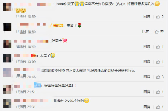 對此,網友紛紛表示驚訝,原來當初的女孩早已「轉大人」,直呼「太美了!」、「NANA妳變了,媽媽不允許妳穿深V」、「我暈暈了」、「老婆好絕」、「今晚的娜娜超好看」,但也有網友持不同意見「知道想轉型風格,但不要太超過,禮服適合的能揚長避短的行嗎」、「能不能多穿點衣服呀」,對於她的轉型更有網直批:「可不可以不要再老往成熟路線走了?有些藝人想少女都不少女了」