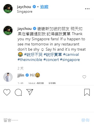 周杰倫在演唱會結束之後,開心地在IG上發文並寫道,「謝謝新加坡的朋友,明天如果在餐廳遇到我,記得讓我買單!」讓粉絲們看到都開心到不行,大家都非常期待可以在餐廳巧遇周杰倫,沒想到竟然真的有粉絲遇到了他,他也霸氣的直接買單~