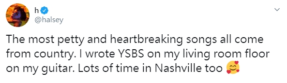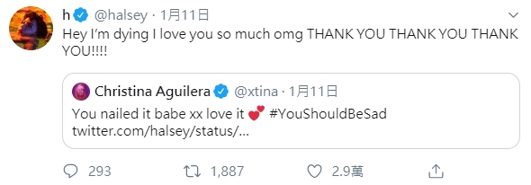 《You should be sad》MV上傳不到12小時,就突破了100萬的點擊率,海爾希對MV亮眼的成績也感到非常開心,她在Twitter上回應粉絲問題時提到:「我是在我家的客廳地板上,用吉他寫出《You should be sad》這首歌的」,同時,她也表示這首歌是向她的偶像們「Shania Twain」、「Christina Aguilera」、「Lady Gaga」和「Carrie Underwood」致敬。11日,Christina Aguilera也為海爾希分享歌曲,並表示了自身的喜愛,驚喜地透露:「我要死了,天阿!我愛你!太感謝了」!