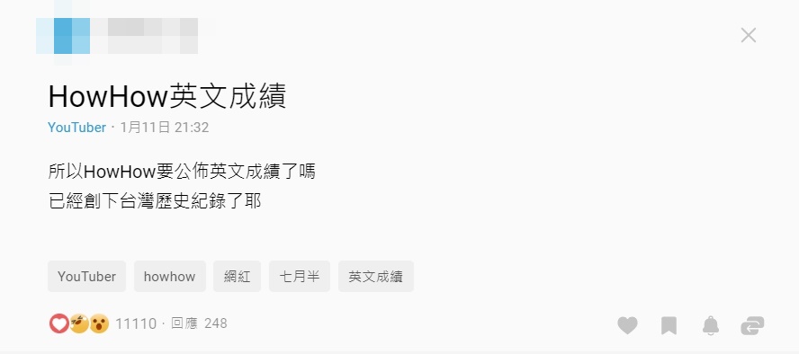 日前適逢總統大選,在投票之前,HowHow也和多位Youtuber好友聯手拍片,呼籲民眾投票,而影片最後,「阿滴」也挖洞給HowHow跳,揚言只要上街投票,HowHow就會公開指考分數!因此大選一結束,立刻有不少網友在Dcard、IG、Youtube等社群平台通緝HowHow,紛紛喊出口號「唯一支持How哥公布指考英文成績」,在網路上引起不小討論度。