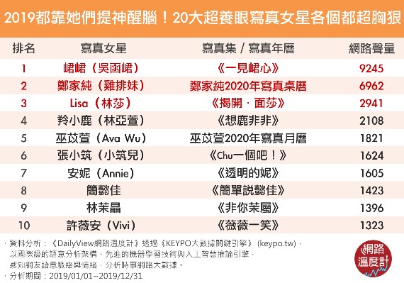 第一名便是中信兄弟啦啦隊成員「峮峮」,人氣超高的她過去曾經是「大學生了沒」固定班底,有「隱乳女神」稱號的峮峮也在2019年發行個人寫真,堪稱是出道以來尺度的最大極限,銷售成績更是年度寫真集之最,讓她成為話題度最高的寫真女星;而總是以性感形象示人「雞排妹」鄭家純則是第二名,近年總是忙於投身公共議題、政治運動的她,也沒忘了回饋粉絲福利,親自操刀寫真年曆的情境和造型搭配,誠意十足,更讓網友們相當滿意。