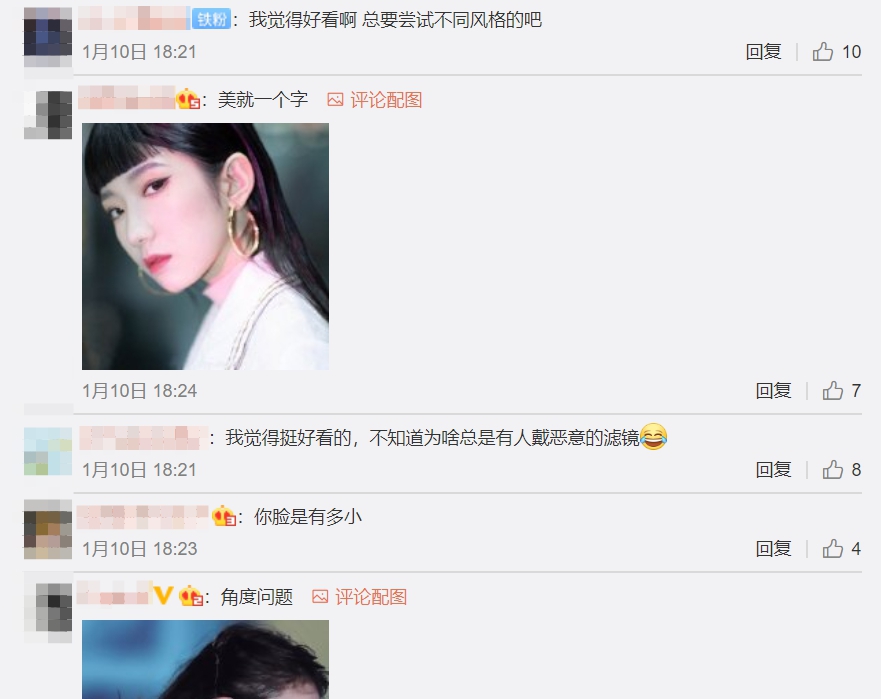 不過孟美岐的眉上齊劉海卻引發部分網友熱議,認為造型把她的臉襯托得變大了,但也有更多網友表示「我覺得好看啊,總要嘗試不同風格的吧。」、「我覺得挺好看的,不知道為啥總是有人戴惡意的濾鏡。」、「你臉是有多小。」、「角度問題吧。」、「我非常喜歡這個呢。」