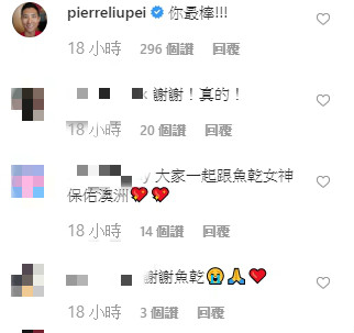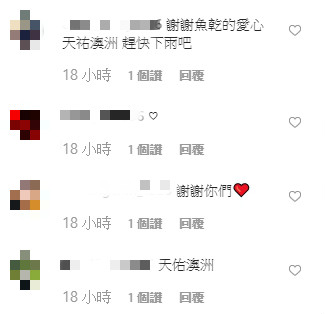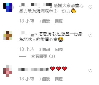 對此網友大力讚賞魚乾的舉動,湧入文章底下留言表示:「你最棒!」、「謝謝!真的!」、「大家一起跟魚乾女神保佑澳洲」、「謝謝魚乾」、「感謝大家都盡心盡力地為澳洲森林出一份力」,她的舉動也引起網友想要為澳洲大火盡一份力,「怎麼捐,我也想盡一份身為地球人的微薄心意」
