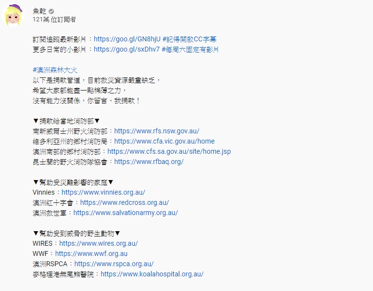 Youtuber「魚乾」11日釋出全新影片,標題為「投票完了嗎?關心一下澳洲大火吧!」,影片一開頭她便關心大家投完票了嗎,並感慨地說「無論你有沒有投票權,我們都一起經歷了一件大事」,接著她提到因為選舉的消息佔據了各大新聞的版面,讓大家沒有那麼關注到「澳洲大火」的事,她特地在此與呼籲大家關注這個消息,「從去年一路燒到今年都沒有趨緩,火災釋放的二氧化碳高達3.5億噸」,遠遠超過台灣一年的排放量,嚴重影響當地生態與環境。她呼籲網友們能關心澳洲大火,並提供捐款管道,希望大家都能盡一點棉薄之力,更承諾「沒有能力沒關係,你留言、我捐款!」,將捐出與留言數量相同的金額。