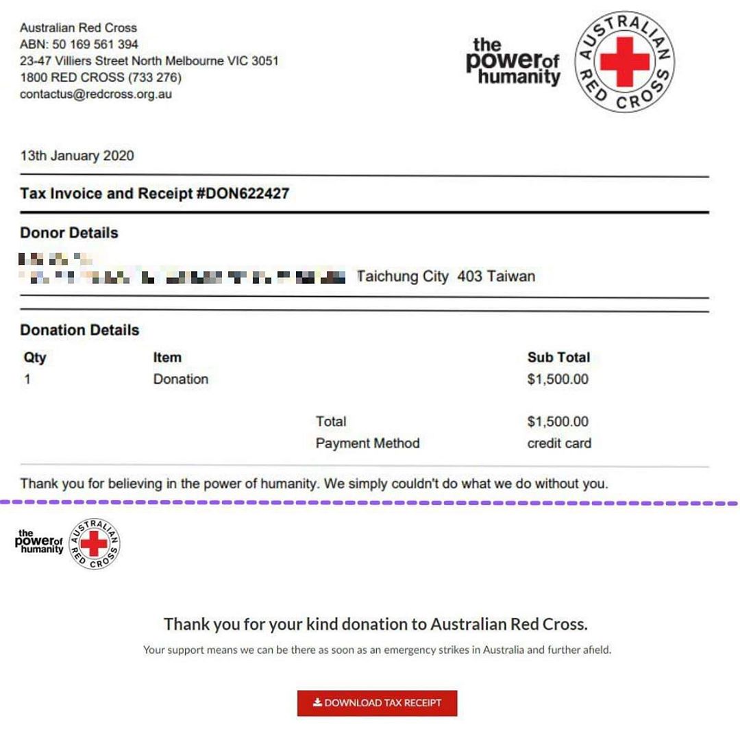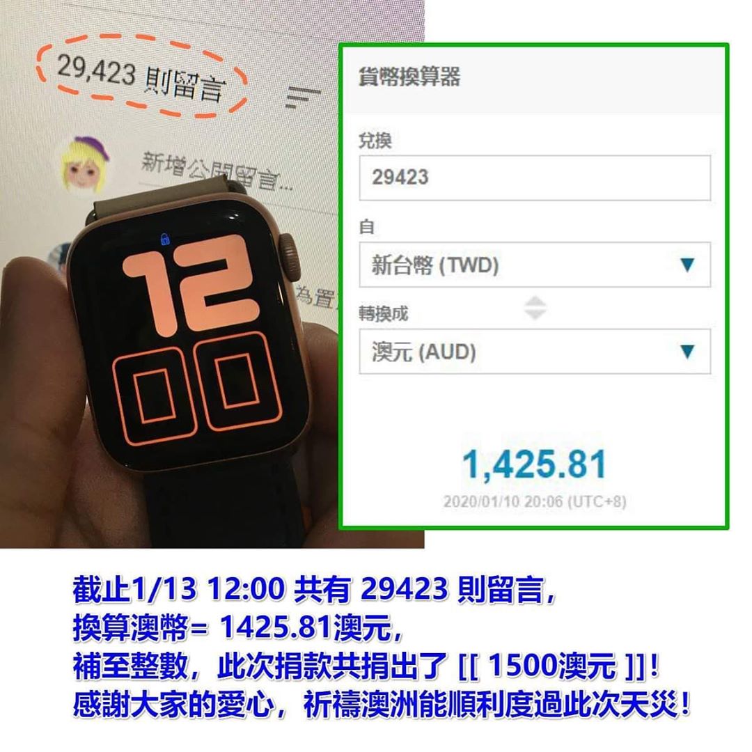 13日,她在IG公布「截止1/13日12:00共有29423則留言」,將這些留言的數量換算成澳幣為1425.81元,她在此捐出1500澳元給澳洲相關單位,並附上捐款收據的截圖畫面,她同時表示感謝「菜喳、滴妹、展榮展瑞」願意捐出相同的金額給澳洲相關單位,關心澳洲大火,為天災盡一份心力。