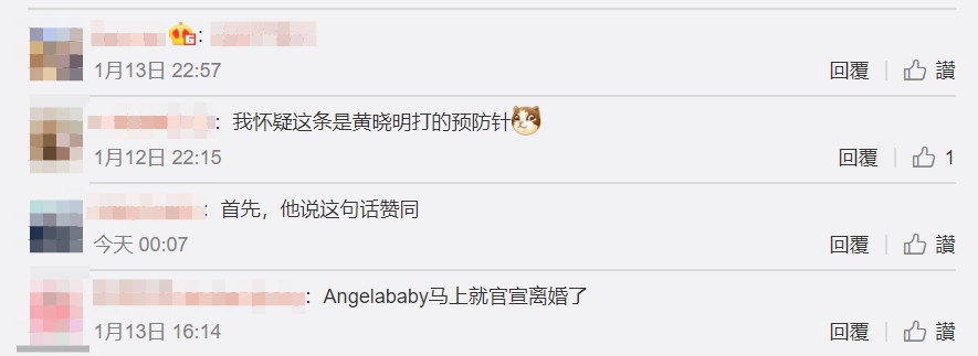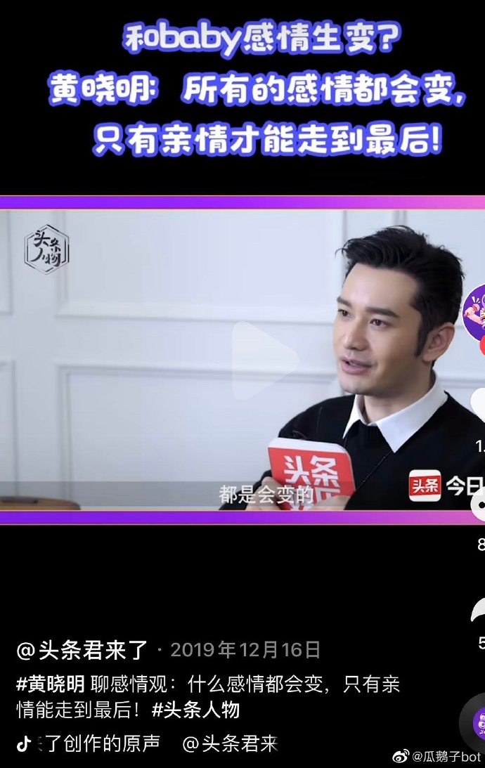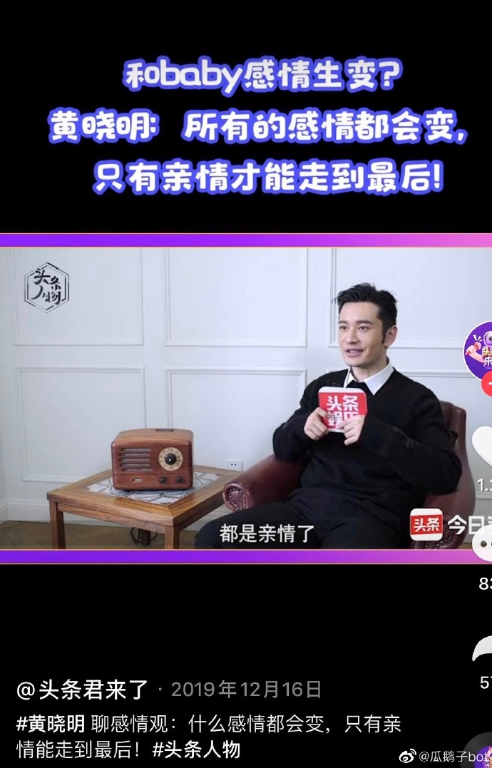 黃曉明近日接受專訪時回應感情觀,有感而發提到「其實我覺得人活到最後,都是親情了,當你到最後你會發現,這世上很多的東西都是會變的。」他的「親情」說法引起網友熱議,網友們分成兩派,一邊是認定他暗示婚姻生變,和Angelababy的關係大不如前,甚至在為之後公開離婚消息做鋪墊,留言表示「以前經常各種綜藝,各種場合秀恩愛,突然很久倆人不合體了,八成離了。」、「什麼都會變,只有親情不會變。這個意思很明顯了。」、「離了最好。」、「我懷疑這條是黃曉明打的預防針。」、「坐等官宣離婚。」