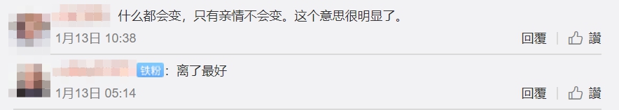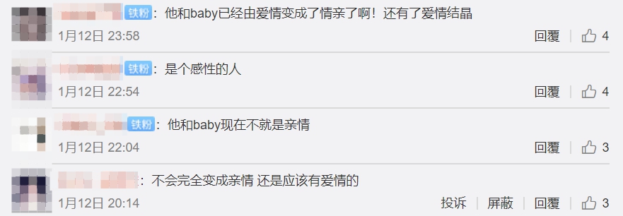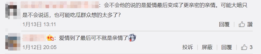 但也有另一派網友理解為他和Angelabaaby關係持續穩定,兩人慢慢地從愛情昇華為親情,紛紛留言「他是說他和baby變成親情吧…」、「愛情到了最後可不就是親情了。」、「會不會他的說的是愛情最後變成了更親密的親情。可能他只是不會說話,也可能吃瓜群眾想的太多了?」、「愛情變成親情啊。。沒毛病」、「他和baby已經由愛情變成了親情了啊!還有了愛情結晶。」、「夫妻到最後不也是親情了麼。」