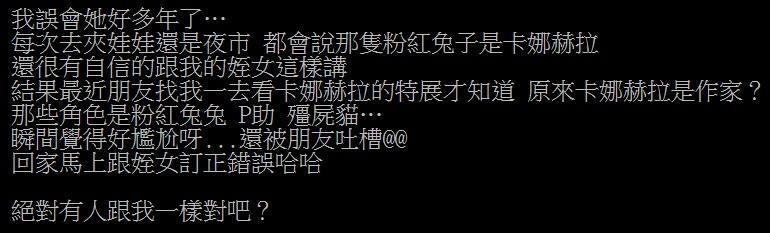 近日,有網友於論壇PTT之「閒聊版」上發佈一篇以「一直以為卡娜赫拉就是那隻粉紅兔子…」為題,引起網友廣大的討論。原PO於內文表示:「每次去夾娃娃還是夜市 都會說那隻粉紅兔子是卡娜赫拉,還很有自信的跟我的姪女這樣講」,殊不知他去了近期在松山文創園區所舉辦的「卡娜赫拉展」後才恍然大悟,原來卡娜赫拉是作家的名字,而她所創作的角色名字分別是粉紅兔兔、P助與殭屍貓,除了當下馬上被身邊朋友吐槽外,原PO表示回家後還要跟姪女解釋清楚,並詢問版上是否有跟他一樣誤會的網友。