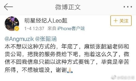 最近在微博上有一名微博用戶叫做「明星經紀人Leo超」,他在網路上發文跟張韶涵討錢,內容直白的寫道,「本不想以這種方式的!年底了,麻煩張韶涵老師和貴公司,把我的服務費給下吧!」甚至還透露張韶涵一直不回微信消息,逼得他不得不出此下策,在微博上公開來討帳,「畢竟是辛苦所得,不想被埋沒,謝謝」。此文一出之後,也迅速在網路上傳了開來,引起網友熱烈討論與關注!