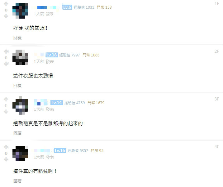 直播影片曝光後立刻被網友輾轉分享,有網友將其片段PO上「遊戲大亂鬪」,再掀起網友一陣議論紛紛,網友表示:「好硬……我的拳頭!」「這真的太優質了」、「這戰袍真是不是誰都撐得起來的」、「這件真的有點猛啊!」、「這件衣服也太勁爆」