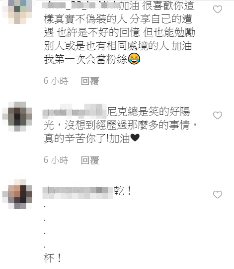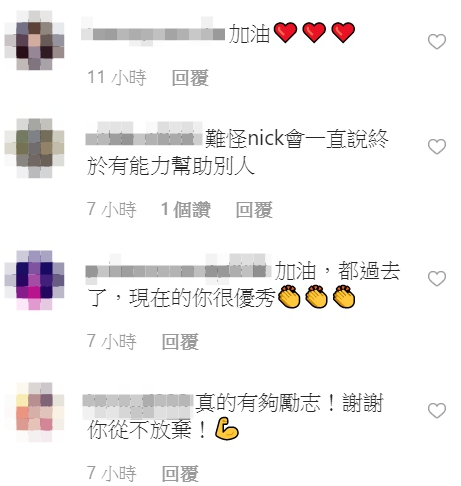 Nick的貼文一出,吸引許多網友力挺安慰,紛紛留言鼓勵他「加油!謝謝你從不放棄!」,更有網友感慨表示看不出Nick陽光笑容的背後,藏了這麼多的故事,「難怪nick會一直說終於有能力幫助別人」,硬漢兄弟成員「閃亮亮」也留言鼓勵他,更透露兩人曾聊過彼此的經歷,「一直都知道你是個努力生活的男生,加油,nick」。