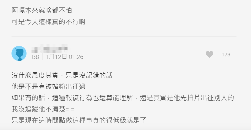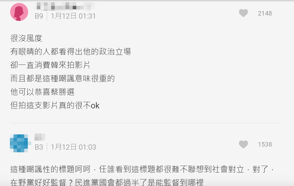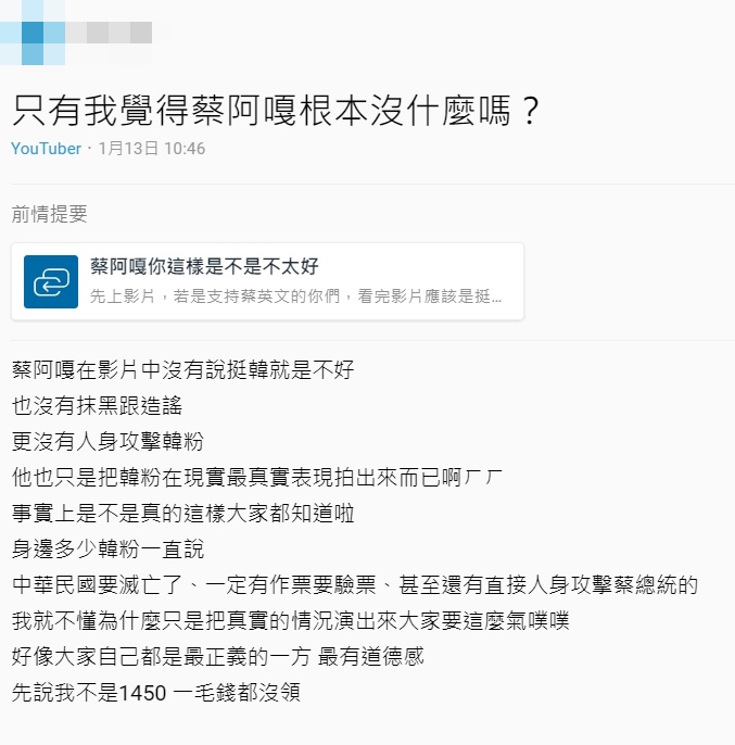 不過也有網友提出不同觀點,認為蔡阿嘎並沒有在影片中抹黑造謠和人身攻擊,只是將韓粉的真實反應拍出來了而已,影片內容根本無傷大雅,「選後大家都變聖人了,我也是滿臉問號」、「蔡阿嘎又不是第一次拍這種影片,講真的,就是大家愛看,他才一直拍,笑笑就好到底在認真什麼,沒有人是中立的」、「選前他們那嘴臉說有多囂張就有多囂張,輸了剛好罷了」、「結果跑去韓粉社團看,跟他影片呈現的差不多」、「選前嘴韓粉嘴得很爽,選後就開始表現友善包容哦,這裡的風向我真的看沒有」。