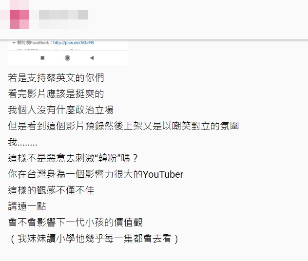 蔡阿嘎影片上傳後,在網路上掀起高度熱議,有許多網友在Dcard發文討論此事,光在YouTuber版上就有5篇不一樣的文章,其中有網友表示「這樣不是惡意去刺激“韓粉”嗎?你在台灣身為一個影響力很大的YouTuber,這樣的觀感不僅不佳,講遠一點,會不會影響下一代小孩的價值觀」,引起許多網友共鳴,紛紛認為蔡阿嘎很沒風度,選後還持續躲在中立後面製造對立。