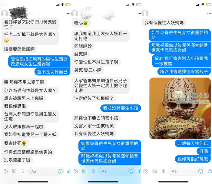 小A辣日前在臉書粉專上傳網友私訊的截圖,只見其中網友劈頭就問切掉男性生殖器後,該怎麼上廁所?隨後又提到小A辣是為了騙男人上床,直批「你再怎麼整都還是像男的,別浪費錢了啦!」各種辱罵讓小A辣決定不再容忍,回嗆對方「代代男盜女娼」!