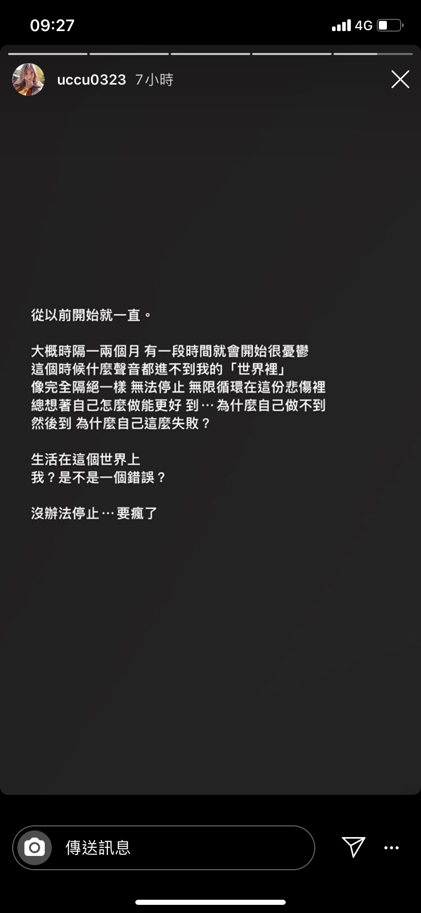 在鏡頭前一向開朗大方的瑀熙,日前深夜卻罕見在限時動態貼「自卑文」,自曝私下不為人知的低落情緒。她透露自己其實每當時隔一兩個月,就會陷入一段時間的憂鬱低潮無法自拔,「這個時候什麼聲音都進不到我的『世界裡』」,表示這樣的狀態就像完全被隔絕一樣,甚至無法停止,這樣的情況其實已經持續了很久。