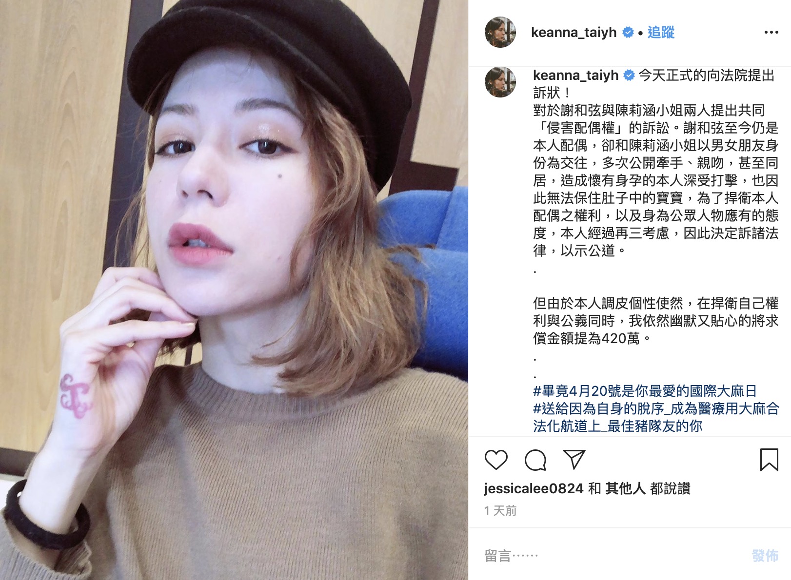 正宮Keanna在本月13號時發文表示將對兩人提告「侵害配偶權」,並求償420萬元,而這個金額其實也是暗藏玄機,她表示:「但由於本人調皮個性使然,在捍衛自己權利與公義同時,我依然幽默又貼心的將求償金額提為420萬。畢竟4月20號是你最愛的國際大麻日」,再次諷刺謝和弦。對此謝和弦也表示自己將反擊控告Keanna侵佔莉婭手機,更指控Keanna從頭到尾都把小孩當籌碼,說到:「我是小孩也不希望來到這世界上,我們的婚姻失敗好聚好散承認吧!」