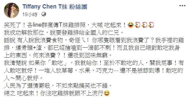 T妹辣曬雞排合影,卻也引來不少人直批「浪費食物」,T妹對此也做出回應表示,「我手裡的雞排,連骨頭+渣,都已經嗑到一滴都不剩!而且我自己絕對敢吃我身上的東西,何來浪費?!」極力撇清浪費之說。