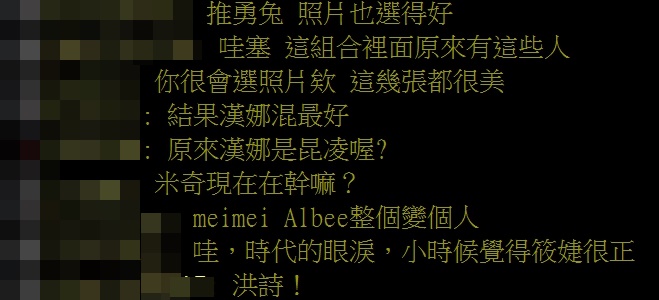 PTT文章一出,立刻引來許多鄉民紛紛留言討論,「昆凌黑澀會之光」、「玉兔變很正」、「唯一支持 Albee」、「時代的眼淚」、「玉兔以前就很正,現在還是正」、「哇,時代的眼淚,小時候覺得筱婕很正」、「好懷念啊,國小回憶」、「看完突然意識到自己真的老了」。