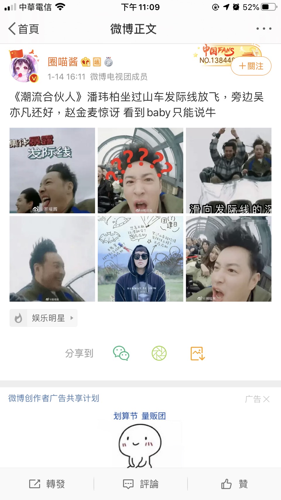 知名男藝人潘瑋柏出道多年,歌唱功夫了得,才華洋溢的他演藝成績十分亮眼,在演藝圈擁有一定的份量,近年來他除了歌唱事業外,更跨足影劇界,將事業重心轉往中國發展,參加了許多中國綜藝節目。日前,潘瑋柏在大陸綜藝節目《潮流合夥人》中與主理人店長吳亦凡一行人來到遊樂園破解任務,為了獲得獎賞這群合夥人必須一同搭乘雲霄飛車,在飛車從高處衝下來的瞬間坐在第一排的潘瑋柏超高的髮際線被觀眾看光光,引起網友一陣熱烈討論!