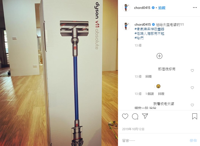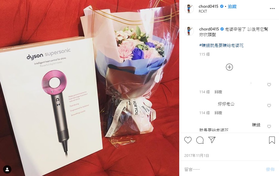 如今演變成了雙方互告的局面,不過有眼尖的網友,從謝和弦以前的貼文中,翻出了他曾經PO出吹風機的照片,並寫下,「老婆辛苦了,以後用它幫妳吹頭髮!」照片中可以看到,是高級的吹風機跟一束漂亮的花!而謝和弦也在2019年10月發文炫耀自己送了吸塵器給Keanna,「送給太座老婆的11」,讓大家清楚知道「吸塵器、吹風機」都是謝和弦自己送給Keanna的!