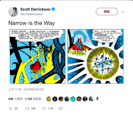 然而先前前導演「史考特德瑞森」也曾在推特上發出三張奇異博士原著的漫畫圖,畫面中僅出現一句對白「我選擇好的那一面」(I choose the good),而導演更寫下「直到我不這樣」(until I don’t),接著再發出兩張組圖上頭奇異博士說了「不再是光明了」、「這是個現實的宇宙結構」,在畫面中也出現疑似永恆族的微觀,對此網友們也紛紛猜測奇異博士在第二集時會黑化成為「大反派門徒」。