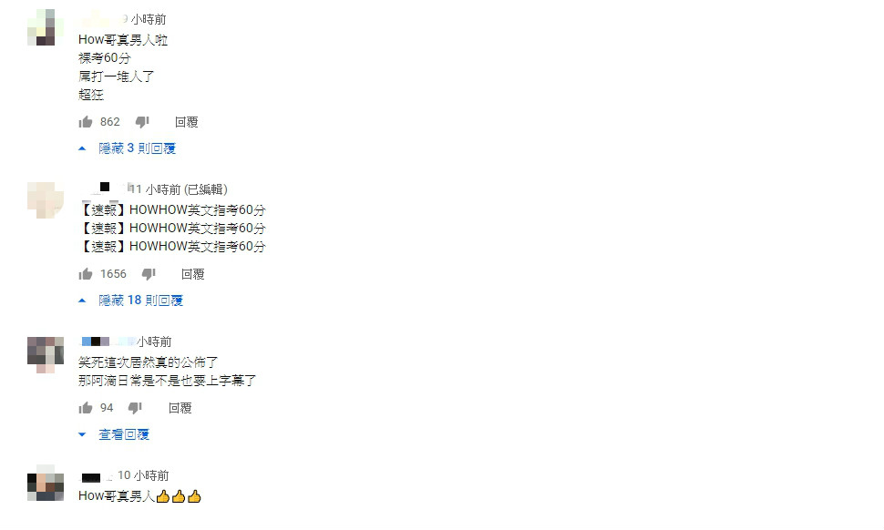 影片一出,立刻引起軒然大波,HOWHOW還特地在影片介紹處寫著:「該請雞排的該跳池塘的換你們了」,讓網友瘋狂紛紛湧入留言表示:「How哥真男人啦!裸考60分」、「速報!HOWHOW英文指考60分」、「我應該考不了那麼高分」、「笑死這次居然真的公布了,那阿滴日常是不是也要上字幕了」、「等好久終於出爐!謝謝HOWHOW的犧牲成就了民主」