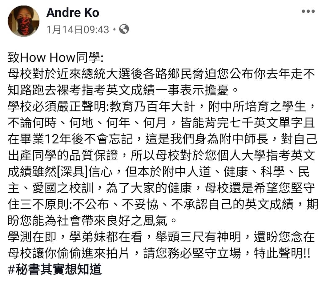 影片一出引發網友瘋狂議論,話題熱度從去年到今年都尚未退燒,總統大選結束後,不少網友在Dcard、IG、Youtube等社群媒體通緝HowHow公佈指考成績,並喊出「唯一支持How哥公布指考英文成績」,再度掀起一陣熱潮。除了粉絲相當關心他的英文指考成績之外,HowHow也公開母校師大附中的玩笑聲明。照片中,秘書表示自己也很想知道HowHow的指考成績,不過也表示師大附中教育出的子弟,都會背完英文7000單,而且畢業了12年都不會忘記,笑稱要HowHow堅持不公開、不妥協、不承認自己的英文成績。而HowHow也感謝母校的支持,開玩笑表示「自己絕對不會公開」。