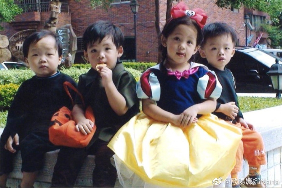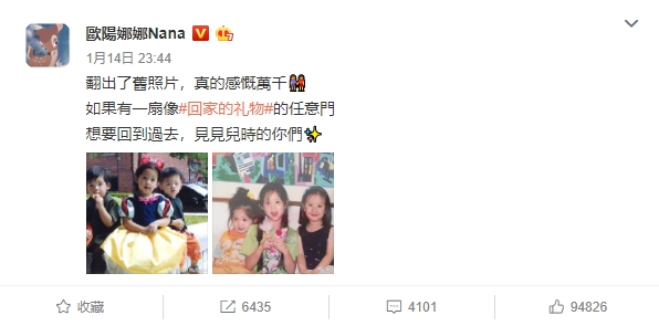 日前,歐陽娜娜在微博上傳兩張童年時期的舊照片,並附註文字:「翻出了舊照片,真的感慨萬千,如果有一扇像回家的禮物的任意門,想要回到過去,見見兒時的你們」,照片中可以看見歐陽娜娜年幼稚嫩的模樣,第一張照片她穿著白雪公主的裝扮與四位小男孩拍照,疑似是在慶祝萬聖節;第二張則是三位女孩的合照,在照片裡女孩們都洋溢著幸福的笑容,天真的模樣看起來無憂無慮。