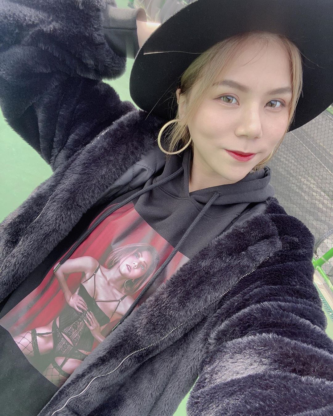 接著,蕾菈又上傳了一張照片,這張照片裡可以看見她整身的裝扮,這次她還拿了一把「是在哈囉」的紅色扇子,看起來似乎是參加完活動的自拍照。這張照片清楚看見她性感的黑色鏤空上衣,隱約透出她白皙的皮膚,胸前的領口超低幾乎裝不住她傲人的前鋒,胸口前黑色綁帶看起來超緊繃,快要被撐破,令粉絲們大飽眼福。