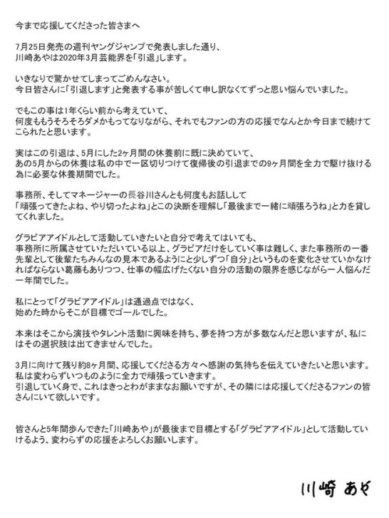 事實上,川崎綾從去年4月時,就宣布了自己要休息充電的消息,結果沒隔多久,她就傳出了引退的消息。據悉,川崎綾是在5月,也就是休養期間做出這個決定,雖然消息一出,大批粉絲們都十分不捨,不過也尊重她的決定,並忍不住猜測她接下來的發展,在網上造成一陣譁然。