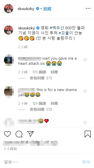 近期多以演員身分活動的秀智,除了電視劇廣受好評之外,她參與主演的電影《白頭山:半島浩劫》也創下近期南韓電影界的票房紀錄,讓她興奮地在IG上PO出照片慶祝!今(17日),秀智在IG上PO出自己的大肚照,讓一票粉絲相當驚奇!