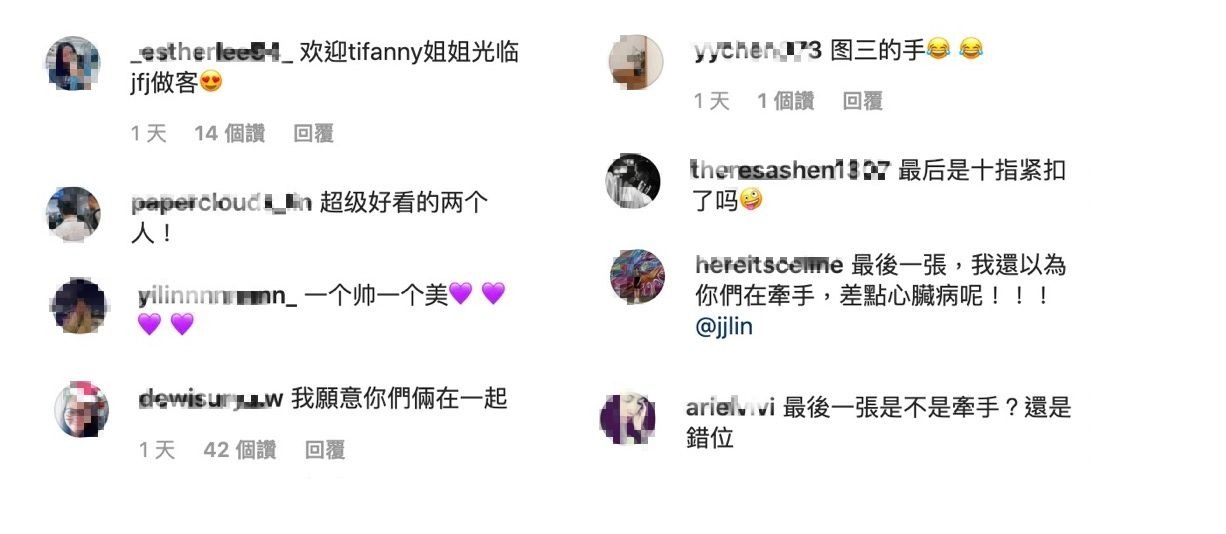 對此粉絲們也興奮的留言表示:「歡迎tifanny姐姐光臨jfj做客」、「超級好看的兩個人!」、「又跟Tiffany meet啦」、「一個帥一個美」、「真好看」,同時有許多網友看見第三張照片時以為Tiffany和林俊傑兩人十指交扣,留言說道:「是牽手了嗎?」、「最後是十指緊扣了嗎」、「最後一張是不是牽手?」,但其實仔細一看是Tiffany的雙手疊在一起,只是因為錯位的關係才導致看上去很像兩人牽著手。