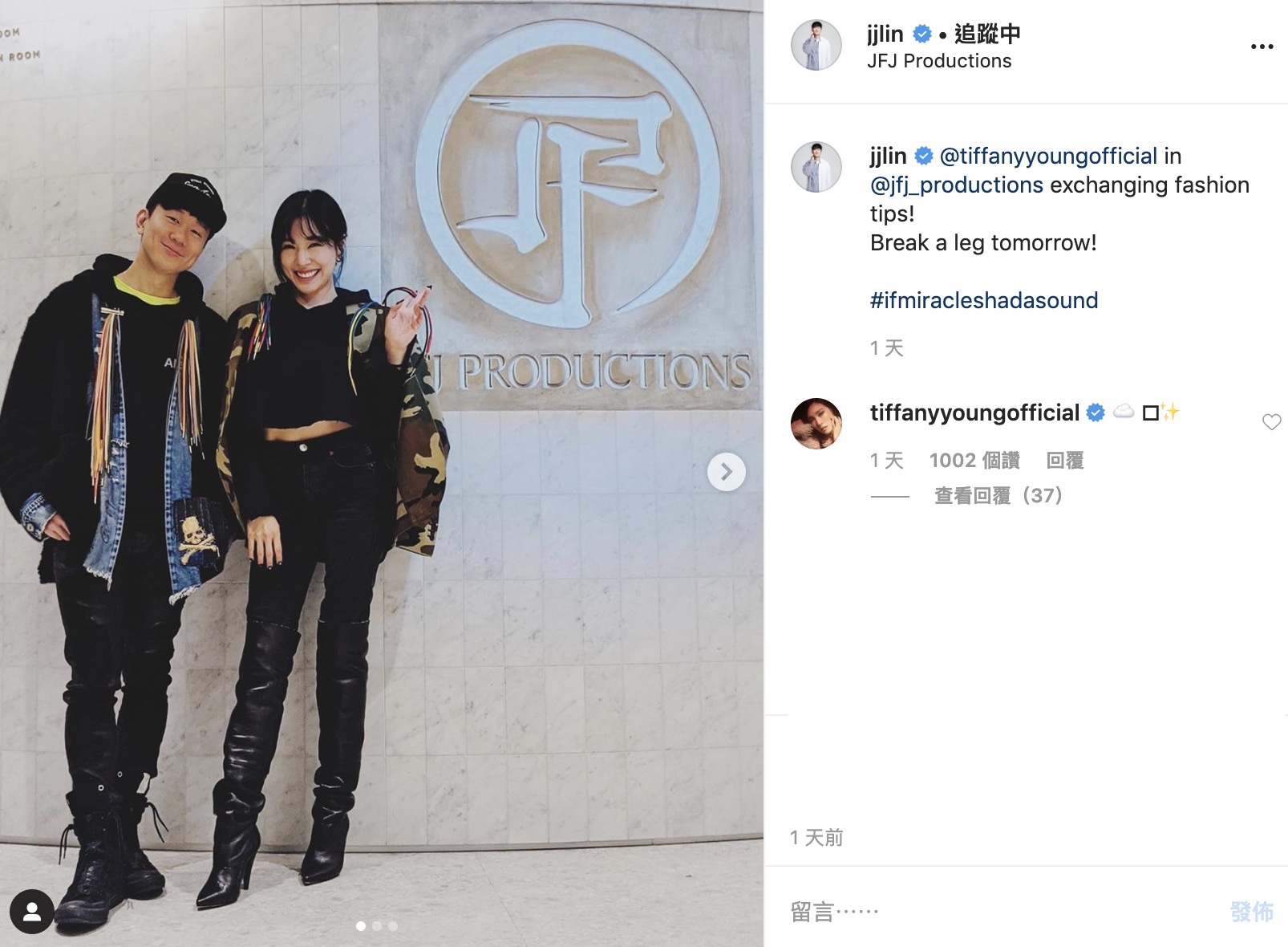 林俊傑在2007年時成立了音樂工作室「JFJ Productions」,在音樂方面也和許多音樂人、機構一起合作,除了音樂上還跨足了潮流方面,林俊傑偶爾也會到工作室門口拍照打卡,JFJ的標誌也成為粉絲打卡的地標,而在昨日(19)南韓女子天團少女時代的成員「Tiffany」來台後也和林俊傑一起在JFJ門口拍照打卡,更配上文字「exchanging fashion tips!」,俊男美女的組合相當養眼。