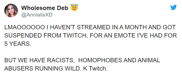近幾年來直播的文化越來越興起,在進行直播時也有許多五花八門的內容,像是:唱歌、跳舞、教化妝穿搭、吃播等風格相當多元與豐富,然而許多直播主為了取得關注都會用盡手段,許多直播平台也對此設下許多直播限制,一旦違規就可能遭到「ban台」。但也經常發生直播主遭到不明原因,而遭到ban台所衍生的抗議事件。美國直播主「Annialis」近日便發現自己遭到Twitch封鎖帳戶,原因卻不是因為直播內容違規,而是一個表情圖片!(想看更多?美知名女歌手「蒙面」走紅毯!「薄紗+內內」一下車…網全看傻:要搶珠寶店?)