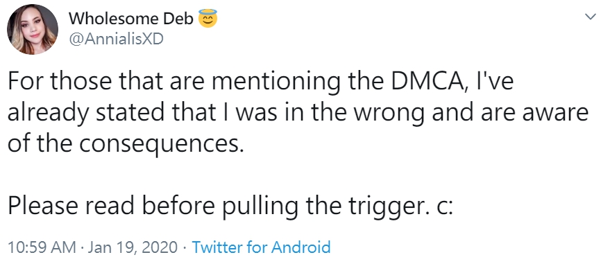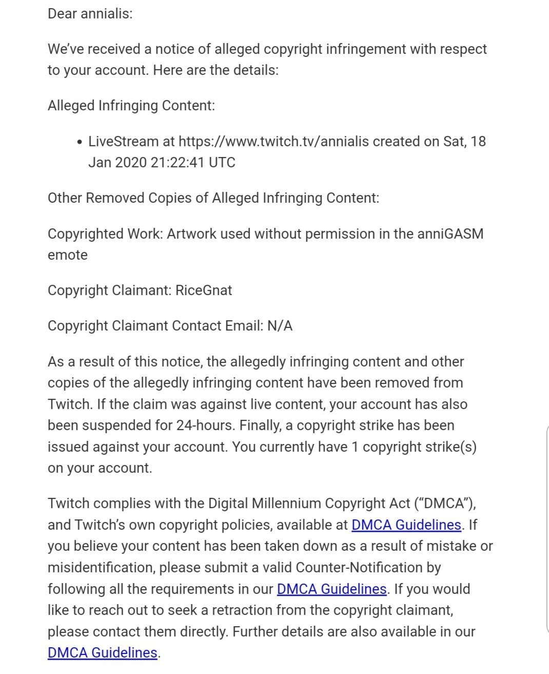 該表情的版權方聲稱,由於Annialis使用了該表情長達五年以上,侵犯了美國的「數位千禧年著作權法」(DMCA),因此Twitch有義務對Annialis作出處罰。而在弄清楚事情的來龍去脈之後,Annialis也發了一條推特表示:「我已經說過我錯了,並且知道後果。」