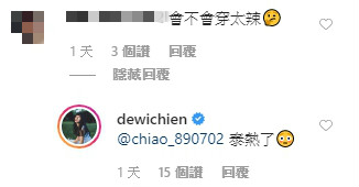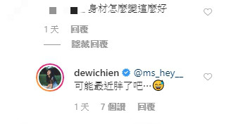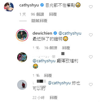 照片一出,許多網友們根本沒把食物放眼裡,留言表示,「眼睛不知道該看哪裡了~」、「難得放福利!」、「會不會穿太辣」、「身材怎麼變這麼好」、「穿這樣太危險」、「辣哦~」、「看到你流口水了」,連徐凱希也調侃地留言說,「目光都不在餐點~」而簡廷芮也幽默回說,「最近胖了的證明!」也有網友細心觀察後表示,「眼睛好種!」讓她無奈地說,「前一晚只睡三小時QQ」。
