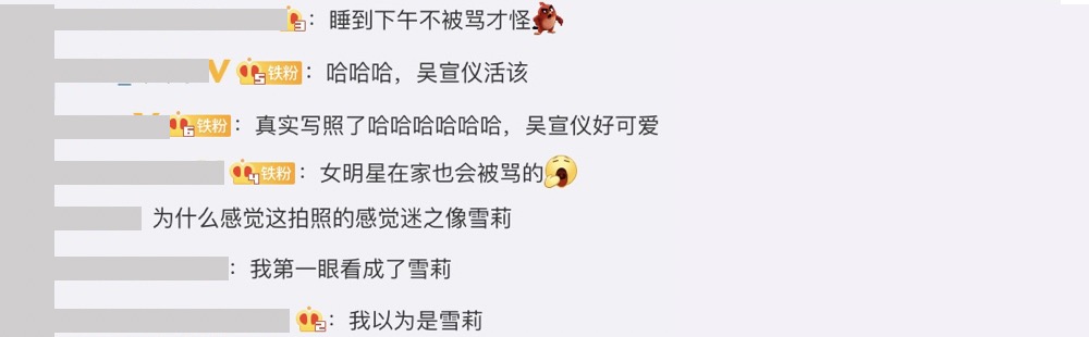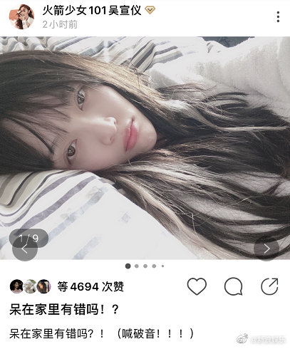 本週就迎來一年一度的過年,許多藝人也會在這段時間回家與家人團聚,其中吳宣儀在20號時也回到家中並曬出一組照片,畫面中吳宣儀躺在床上看上去有些睡眼惺忪,眼神相當迷濛,雖然是以素顏的狀態入鏡,能夠看出吳宣儀的皮膚保養的非常好,除了曬照之外她也配上文字「呆(待)在家裡有錯嗎?(喊破音!)」,稱回家第一天就被媽媽罵。看見吳宣儀俏皮的貼文後,粉絲們也紛紛留言:「睡到下午不被罵才怪」、「哈哈哈,吳宣儀活該」、「真實寫照了哈哈哈哈哈哈,吳宣儀好可愛」,同時也有許多人發現吳宣儀的拍照角度看上去有些神似雪莉,引發熱議。