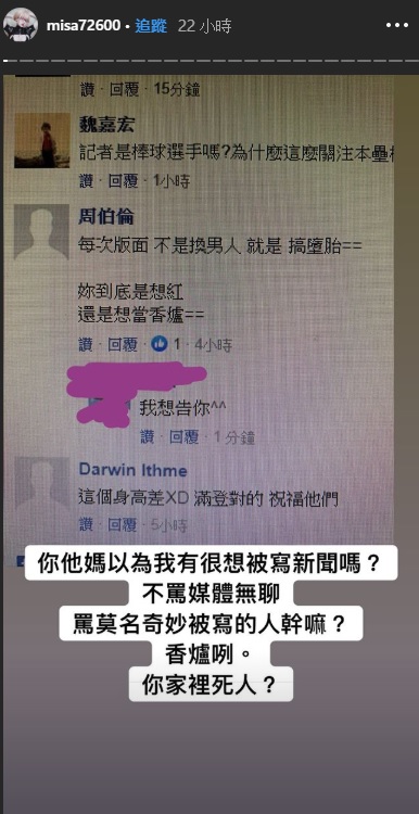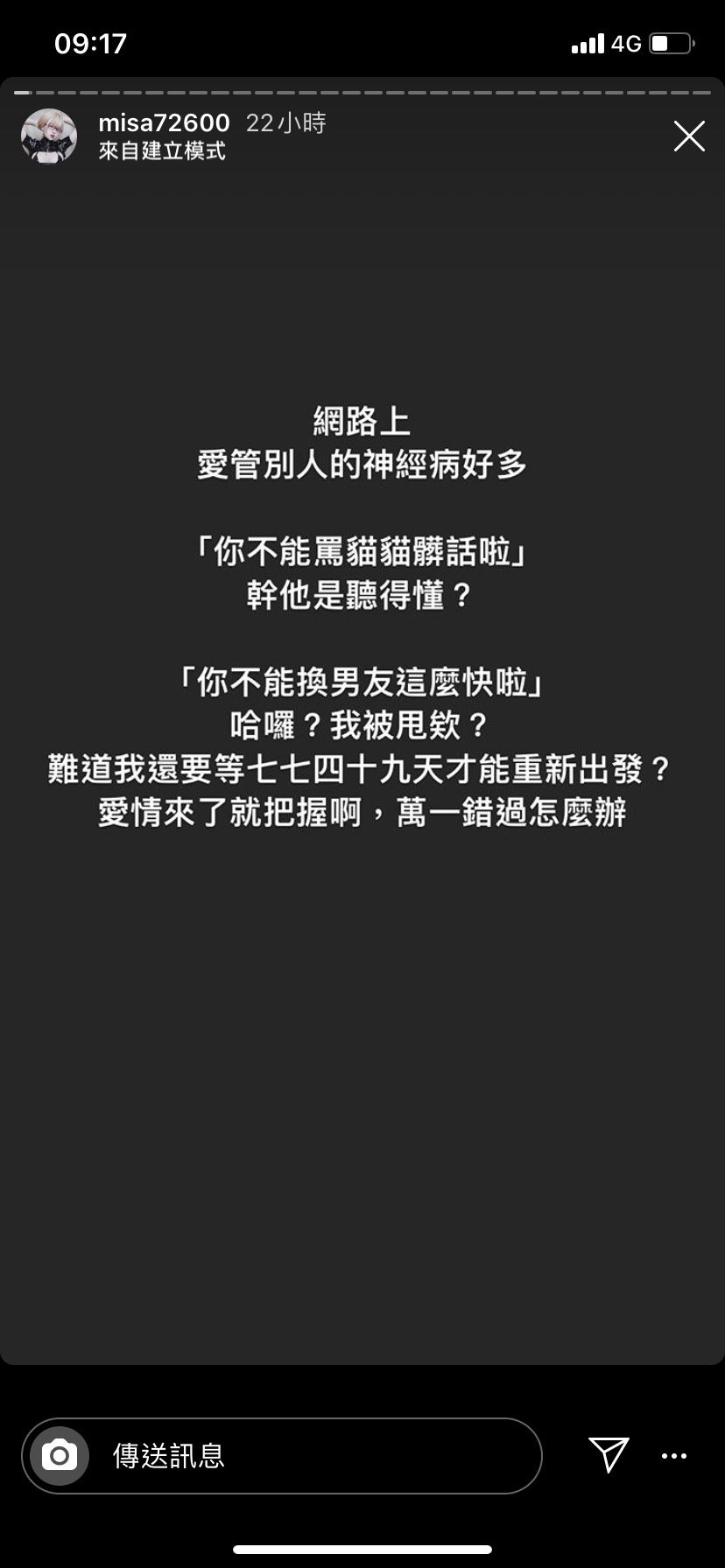 對於新戀情的流言蜚語米砂也在IG限動上表示,「網路上愛管別人的神經病好多」,網友時常會評論她的一舉一動,並告訴她不能換男友這麼快等等,對此她則不以為然表示,「難道我還要等到七七四十九天才能重新出發?」,認為愛情來了就要好好把握,不想錯過!