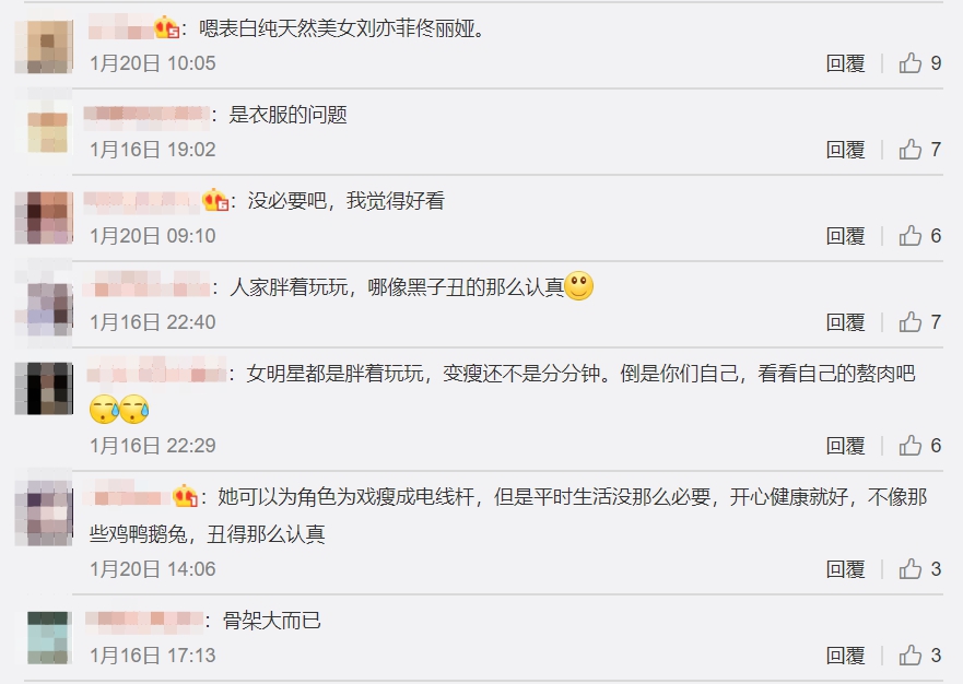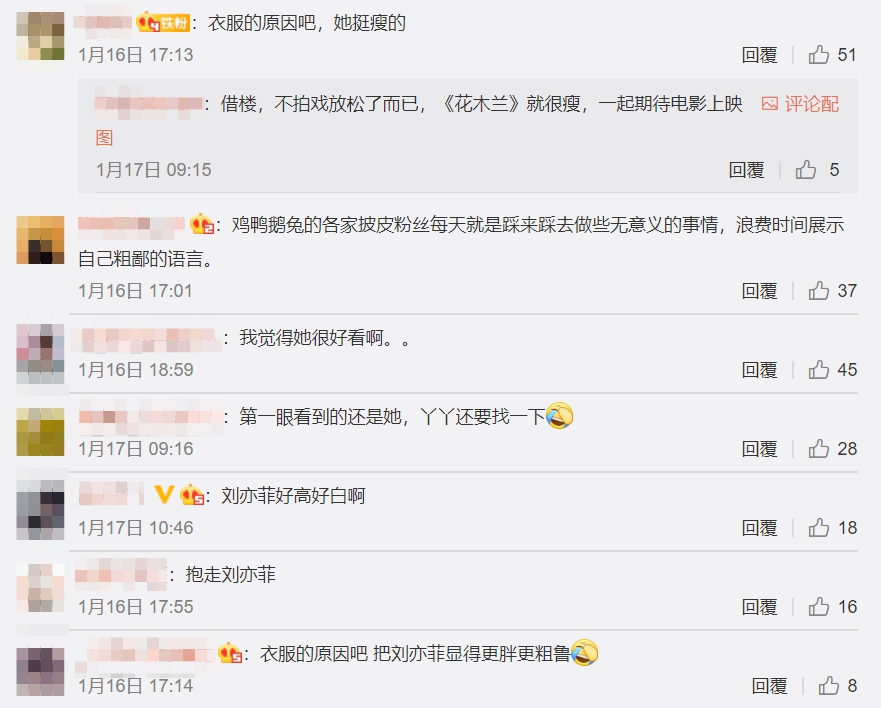 不過也有許多網友力挺女神,紛紛表示「只有劉亦菲最像公主,謝謝。」、「衣服的原因吧,她挺瘦的。」、「第一眼看到的還是她」、「女明星都是胖著玩玩,變瘦還不是分分鐘。倒是你們自己,看看自己的贅肉吧」、「很像迪士尼公主誒。」、「依舊是全場最引人注目的」。
