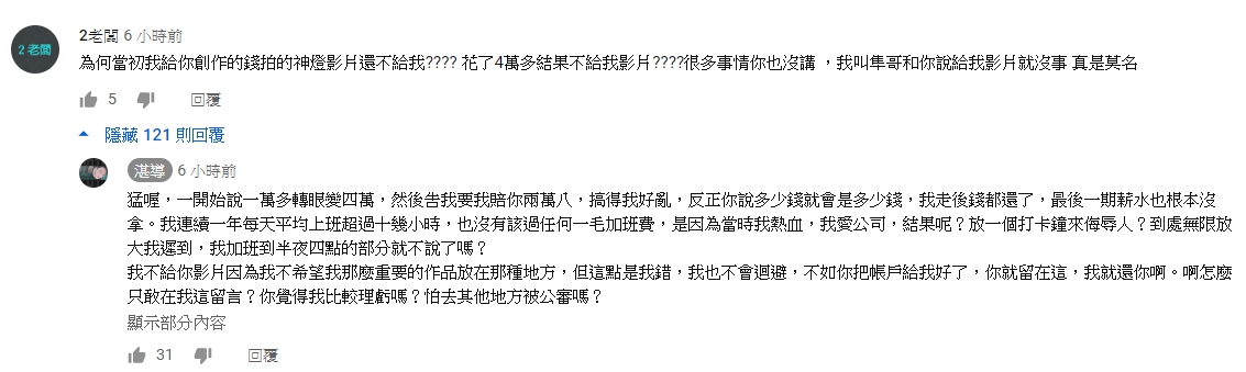 湛導影片上傳後,獲得不少網友關注,而「在不瘋狂」老闆也現身留言,解釋為何訴諸法律要湛導還錢,是因為拍片費用沒喬好超出預算,且最後影片也未交給公司,才會衍生出後來的一連串事件。今(21)日《台灣達人秀》小編也致電「在不瘋狂就等死」老闆詢問詳細情況,老闆提起提告一事則表示,其實後來查出「中間主管」從中有很大問題,導致雙方溝通不良,而老闆甚至有許多事情是看最近的影片才得知,由於該名中間主管也於去年離職,因此現在爆發一連串的事情,就由老闆自己扛下。