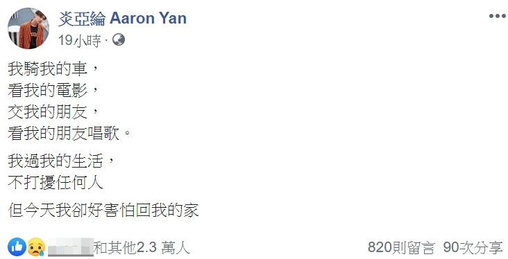 最近炎亞綸被爆出了近兩個月以來的行蹤,除了外出工作之外,還有棒棒堂的阿本在這段時間經常出入他新家也被爆出來,包含了炎亞綸騎自行車,去跟阿本和一大群好友會合看電影、唱歌,讓炎亞綸的私生活被攤開來檢視!他21日也在臉書發文寫道,「我騎我的車,看我的電影,交我的朋友,看我的朋友唱歌。我過我的生活,不打擾任何人」,但沒想到私生活會被跟拍成這樣,讓他無奈又害怕地說,「今天我好害怕回我的家」。